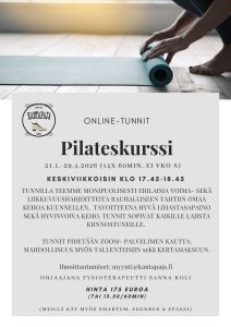 Kantapajan pilateskurssi starttaa taas tammikuussa! Kurssi toteutetaan etäyhteydellä Zoom -palvelimen kautta. Tunneille voit myös osallistua kertamaksulla ja tunneista on mahdollista saada tallenne.